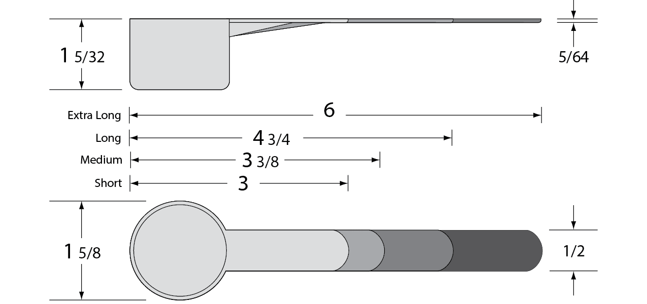 | 4 Overall Lengths | 3″ | 3 3/18″ | 4 3/4″ | 6″ |